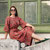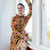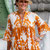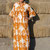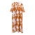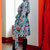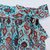 Das Teresa Kleid hat einen V-Ausschnitt und ist mit einem farblich dazu passenden anderen Muster besetzt, sowie die Innenseite der Ärmel sind mit dem gleichen Stoff besetzt.